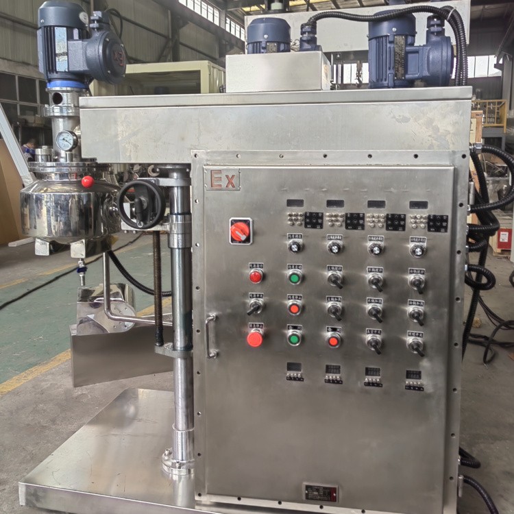 第三種是分散盤式溶解攪拌器,在均質(zhì)乳化機(jī)的攪拌軸底端裝有一圓盤狀的攪拌器--分散盤攪拌器,由電機(jī)直接帶動,轉(zhuǎn)速為1400rpm。它的旋轉(zhuǎn)方向與刮板攪拌器相反。分散盤在攪拌軸上可上下移動調(diào)節(jié),以達(dá)到更佳的效果。這種攪拌器攪拌時相當(dāng)激烈,物料由中心向外翻騰,它的作用是迅速將新加入的組份潤濕混合和分散溶解到液體或膏狀物料中,它是一種剪切力很大的攪拌器,適合高粘度物料。它與均質(zhì)乳化機(jī)的刮板攪拌器和膠體磨組合成另一形式的均質(zhì)攪拌系統(tǒng)。