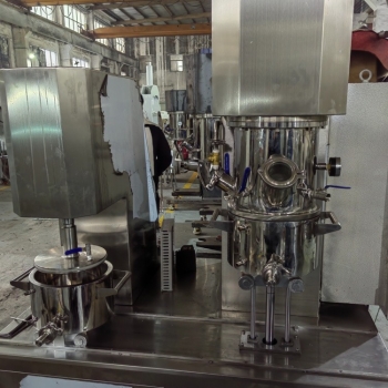 現(xiàn)階段常用的行星攪拌機(jī)通常有兩個(gè)低速檔大行星攪拌槳(通常為多斜漿葉式,大麻花式,框式),一個(gè)或2個(gè)快速大行星攪拌槳(分散化盤(pán))和刮壁槳構(gòu)成。